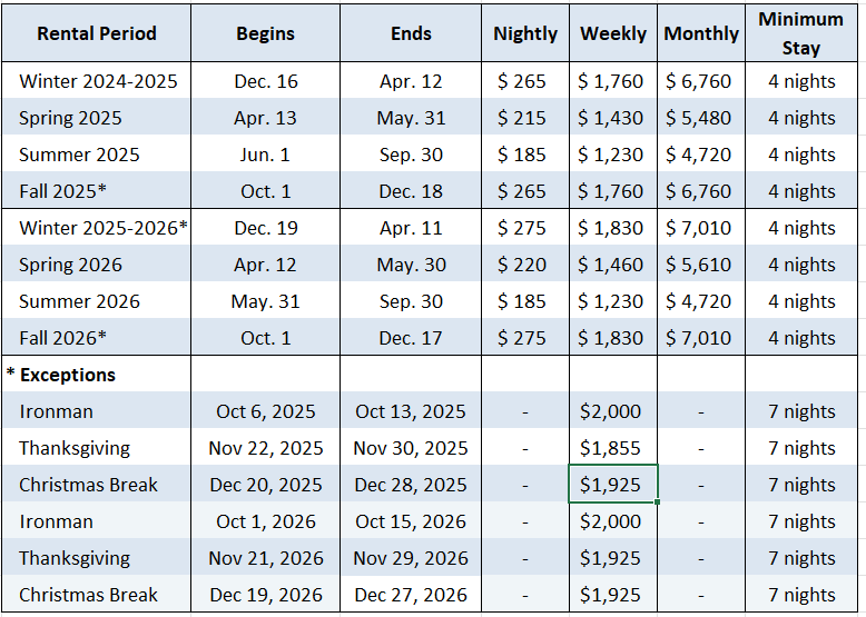 - Seasonal rates in US$, with exceptions for Ironman, Thanksgiving Week & Christmas Break.